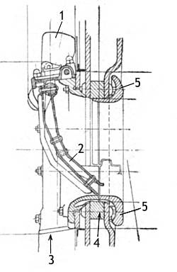 Drzwiczki pneumatyczne są dwudzielne i otwierają się na boki. Uruchamia je silnik działający na sprężone powietrze. Tłoczek tego silnika przesuwa segment zębaty współpracujący z drugim podobnym segmentem i tym samym otwiera drzwiczki. Powietrze do napędu drzwiczek jest doprowadzane przewodem 1 przez zawór. Naciśnięcie pedału powoduje otwarcie zaworu i przepływ powietrza poprzez przewód 4 do silnika pneumatycznego i uruchomienie drzwiczek. Po jego zwolnieniu powietrze z silnika ucieka do atmosfery a drzwiczki się zamykają.